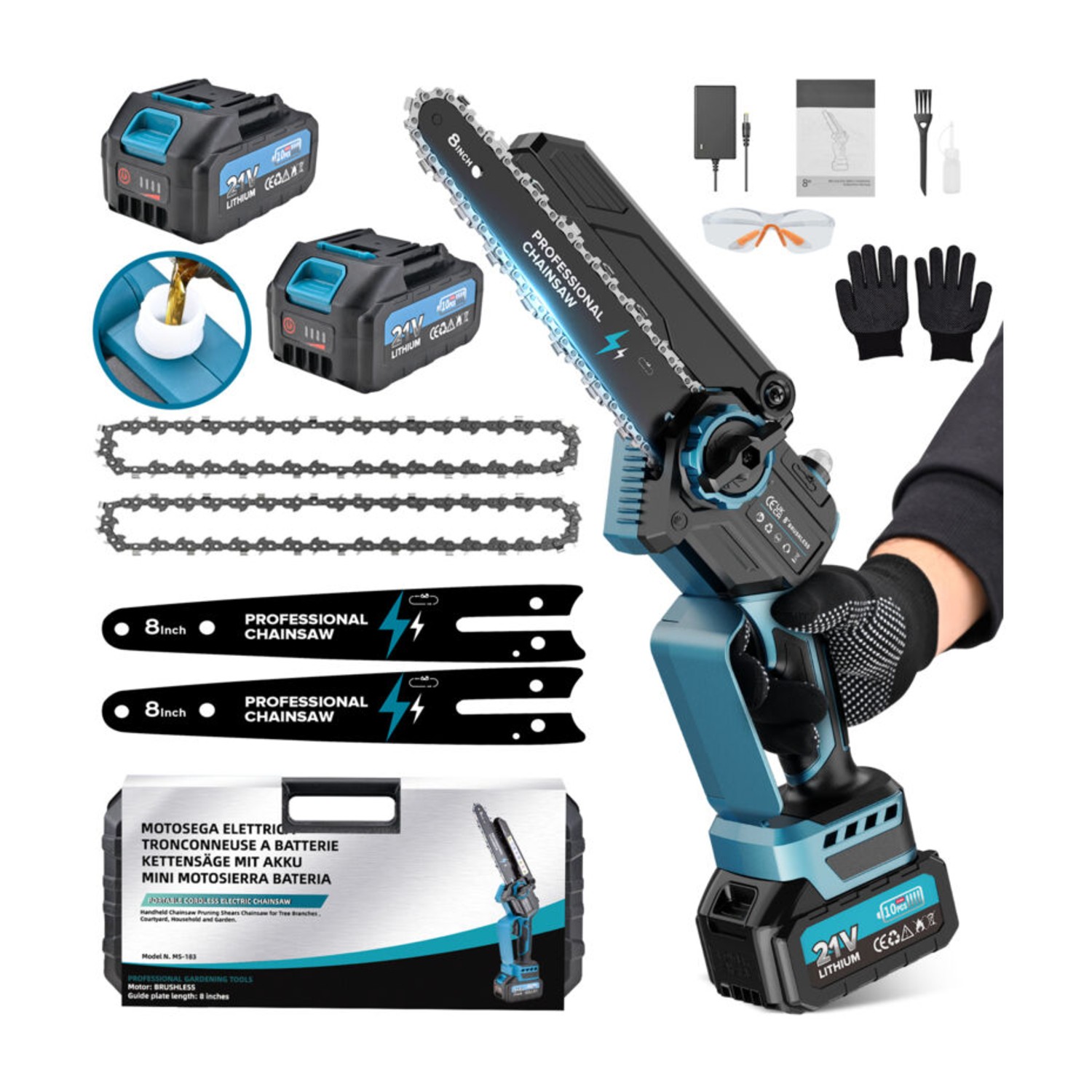 Notre outil électrique compact pour coupe de branches intègre un système de lubrification permettant une alimentation continue en huile de la chaîne. Cette fonctionnalité réduit les frottements et améliore la fluidité de coupe, tout en limitant l’usure des composants. Le mécanisme de sécurité comprend un démarrage en deux étapes, évitant les activations involontaires. L’entretien est simplifié grâce à une conception accessible, permettant un réglage rapide de la chaîne et un remplissage facile du réservoir. Les éléments fournis facilitent les opérations courantes, garantissant une maintenance régulière sans outils complexes. L’ensemble contribue à prolonger la durée de vie fonctionnelle de l’équipement tout en assurant une utilisation fiable.