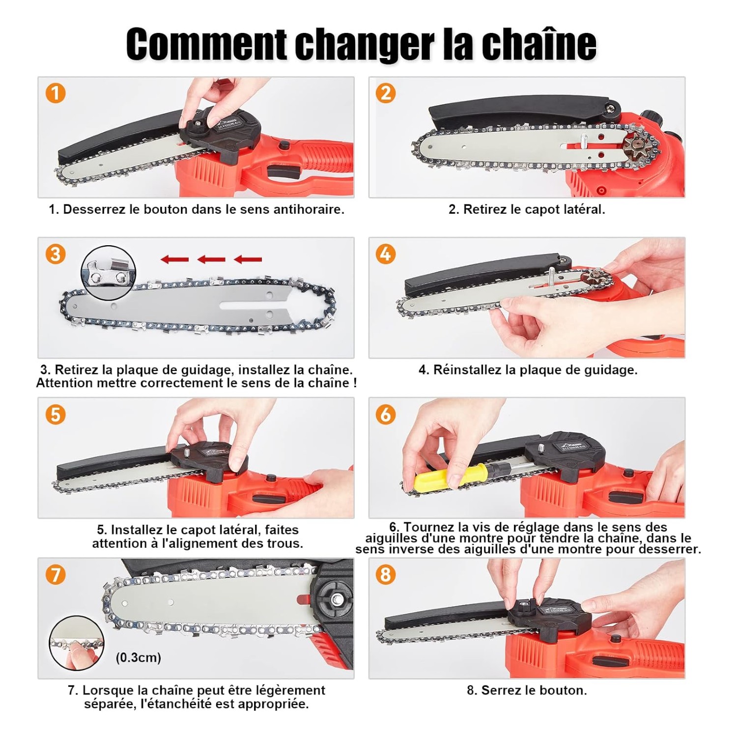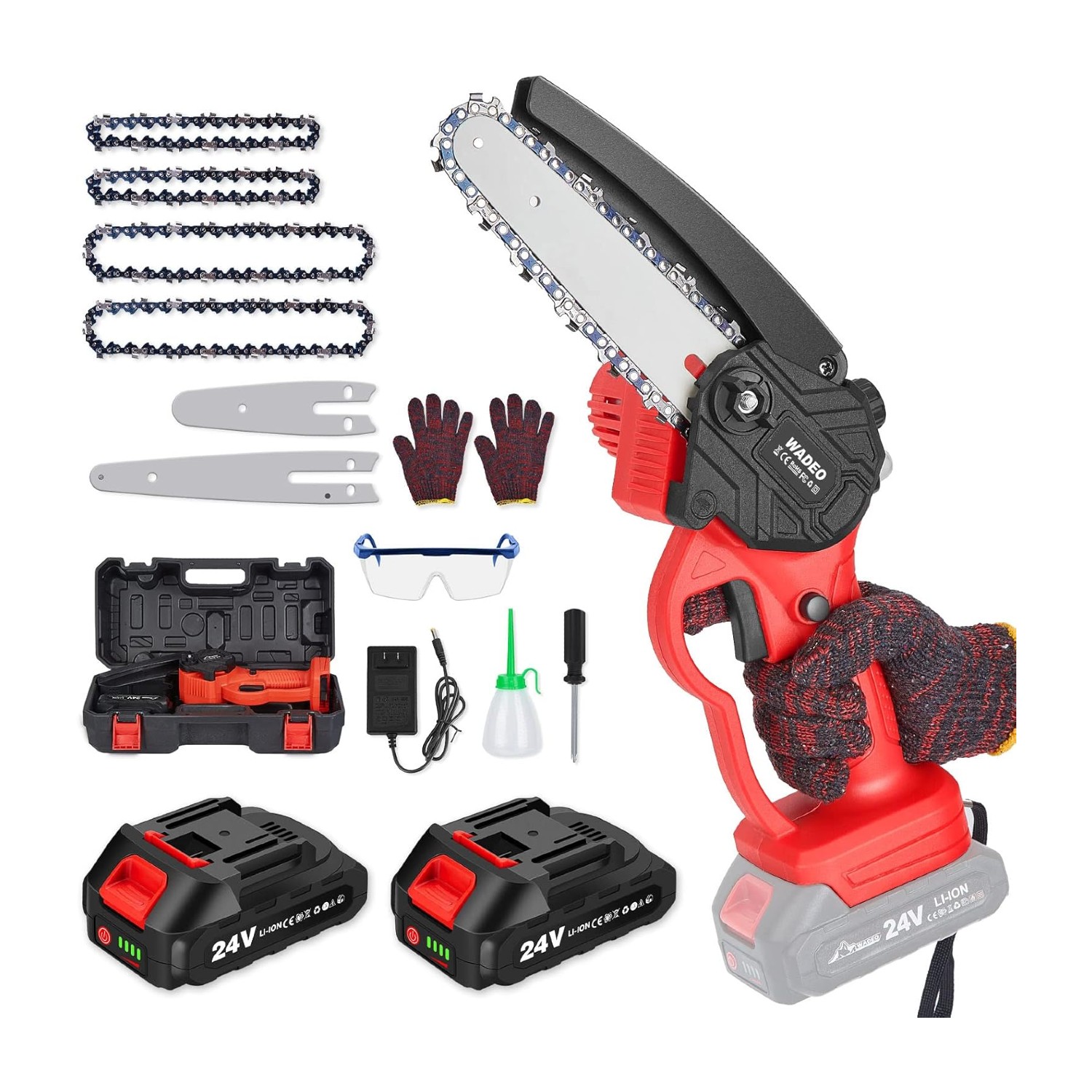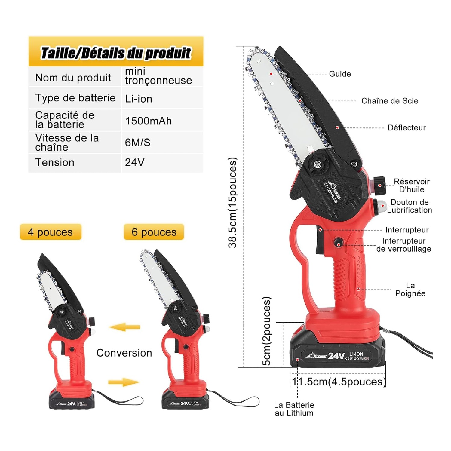 Notre scie est fournie avec des accessoires pratiques qui la rendent polyvalente : deux chaînes et deux barres de guidage de 4 pouces et 6 pouces, pour s’adapter à différentes tailles de branches. Le pack comprend également des gants, des lunettes de sécurité, un chargeur, un tournevis, ainsi qu’une bouteille d’huile pour l’entretien automatique de la chaîne.