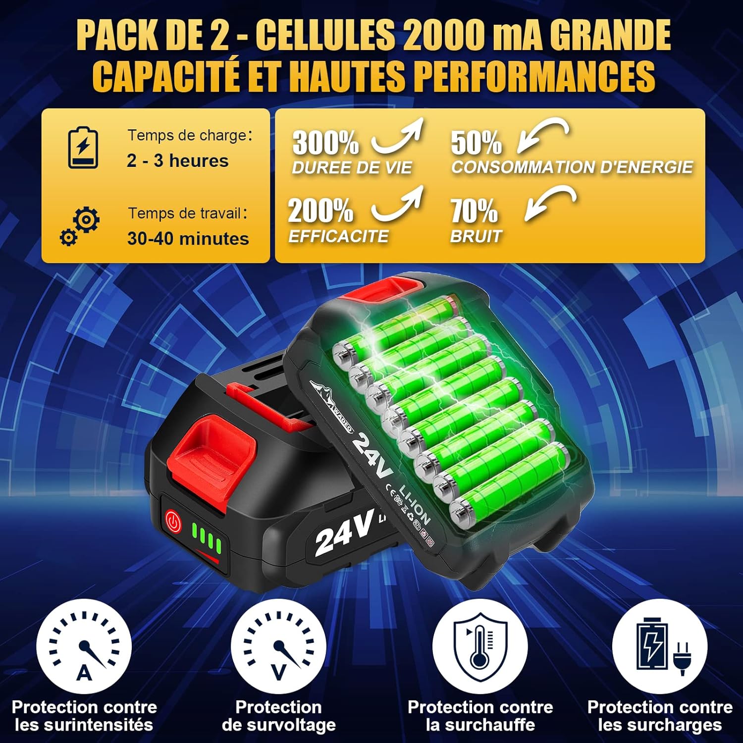 Avec ses 2 batteries rechargeables de 24V et 2000 mAh, vous pourrez utiliser la scie pendant 50 à 60 minutes, sans interruption. La batterie est également équipée d’un indicateur de charge, vous permettant de vérifier le niveau à tout moment. Plus besoin de vous soucier de la durée de vie de la batterie pendant vos travaux.