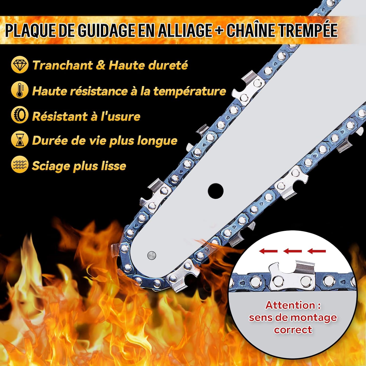 Équipée d’un moteur en cuivre pur et d’une chaîne de haute qualité, notre scie électrique permet une coupe rapide et efficace. Vous pourrez couper des branches et des bûches de jusqu’à 4 pouces de diamètre en à peine 5 secondes, ce qui vous fera gagner un temps précieux. Idéale pour les travaux de jardinage, elle simplifie grandement l’élagage et la découpe du bois.