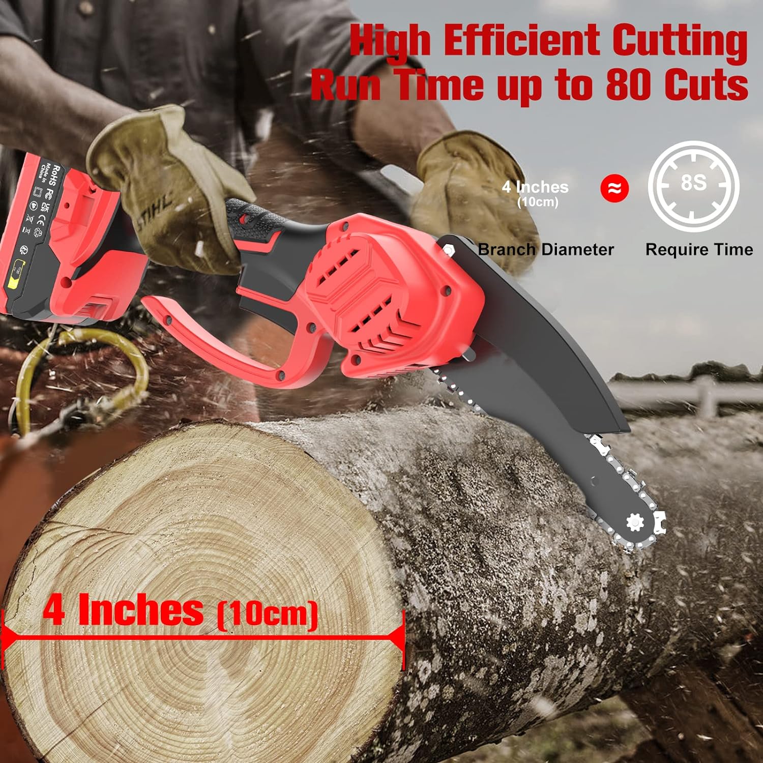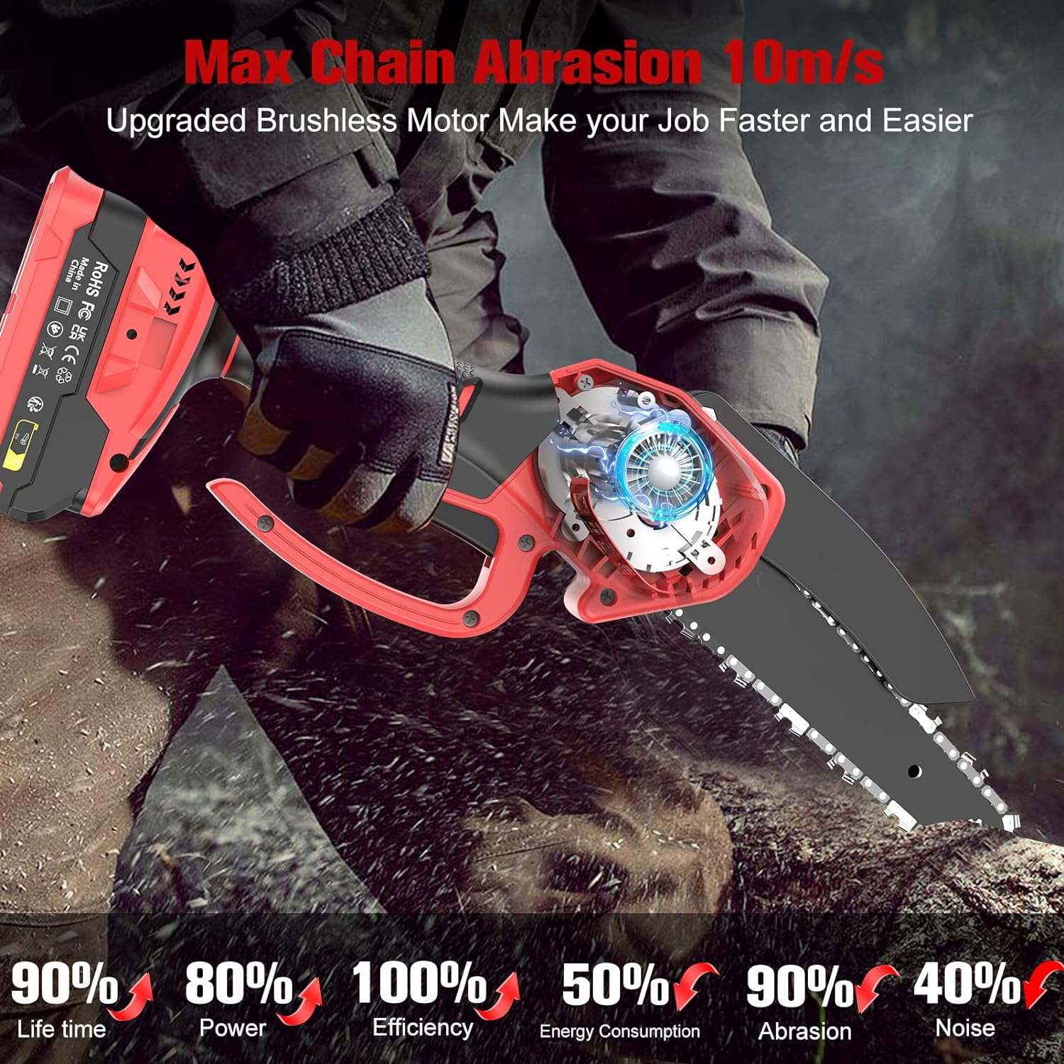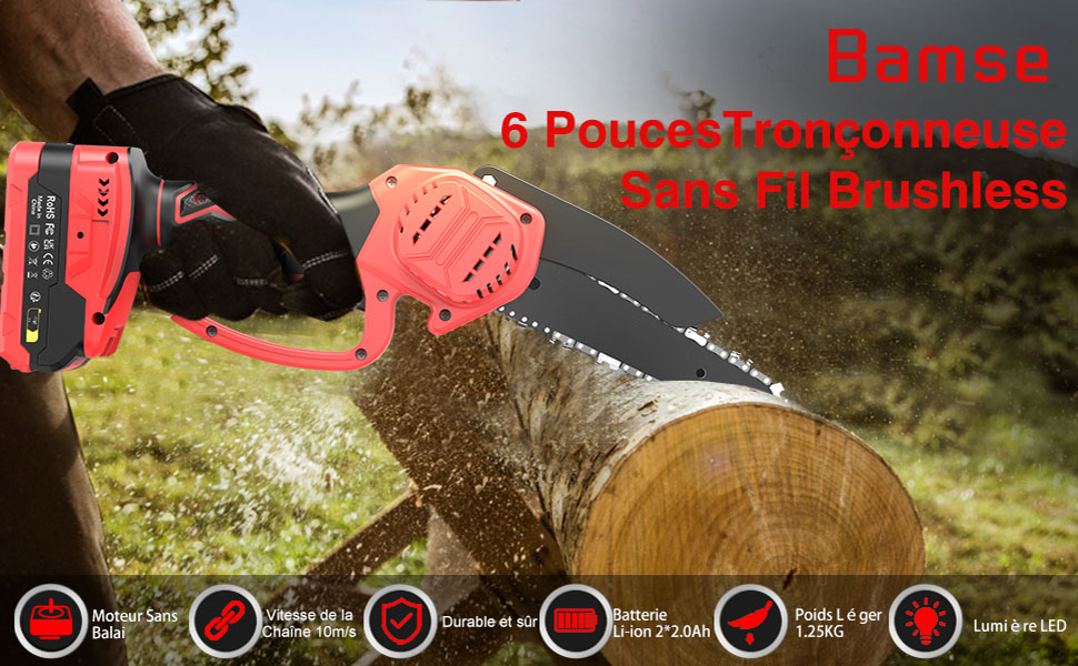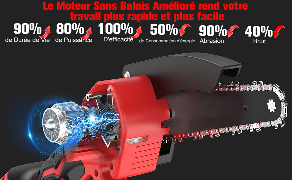 La tronçonneuse portable est équipée d’un moteur sans balai puissant qui augmente la durée de vie de 90% et la puissance de sortie de 80%. Avec une vitesse de chaîne de 10m/s et un guide-chaîne de 6 pouces, elle peut couper des bûches d’un diamètre d’environ 4 pouces en seulement 8 secondes. Cette technologie garantit un fonctionnement sans blocage, un faible bruit et une haute efficacité.