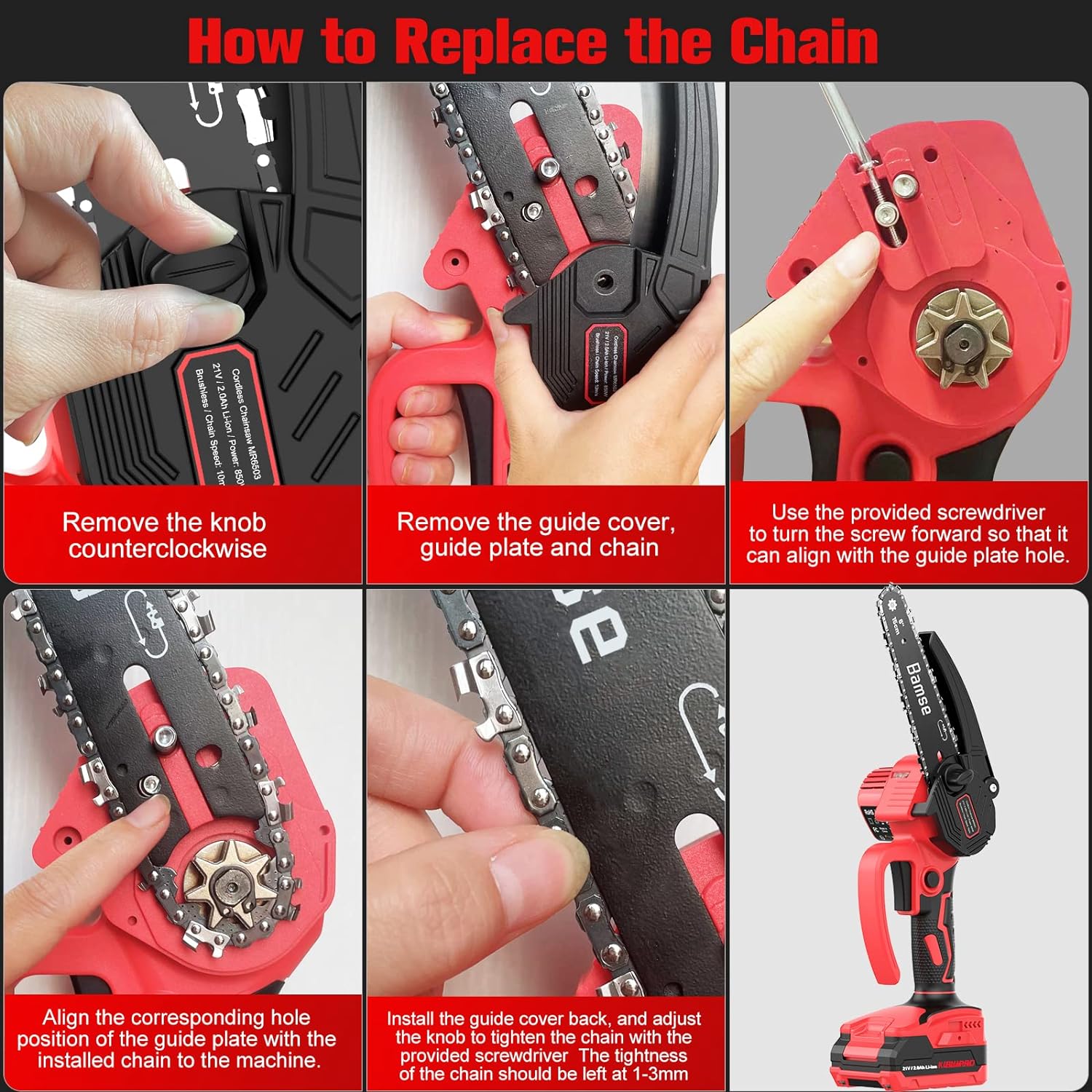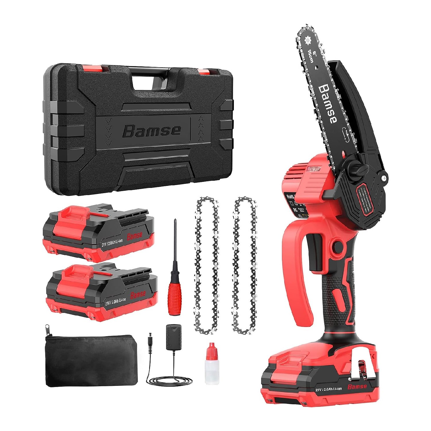 Dans ce kit, vous trouverez tout ce dont vous avez besoin pour commencer, y compris la tronçonneuse, les batteries, la lame de plaque de guidage, les chaînes, le chargeur, la bouteille d’huile, le tournevis et le manuel d’utilisation. Avec notre tronçonneuse à batterie, vous êtes prêt à relever tous les défis de coupe avec facilité et efficacité.