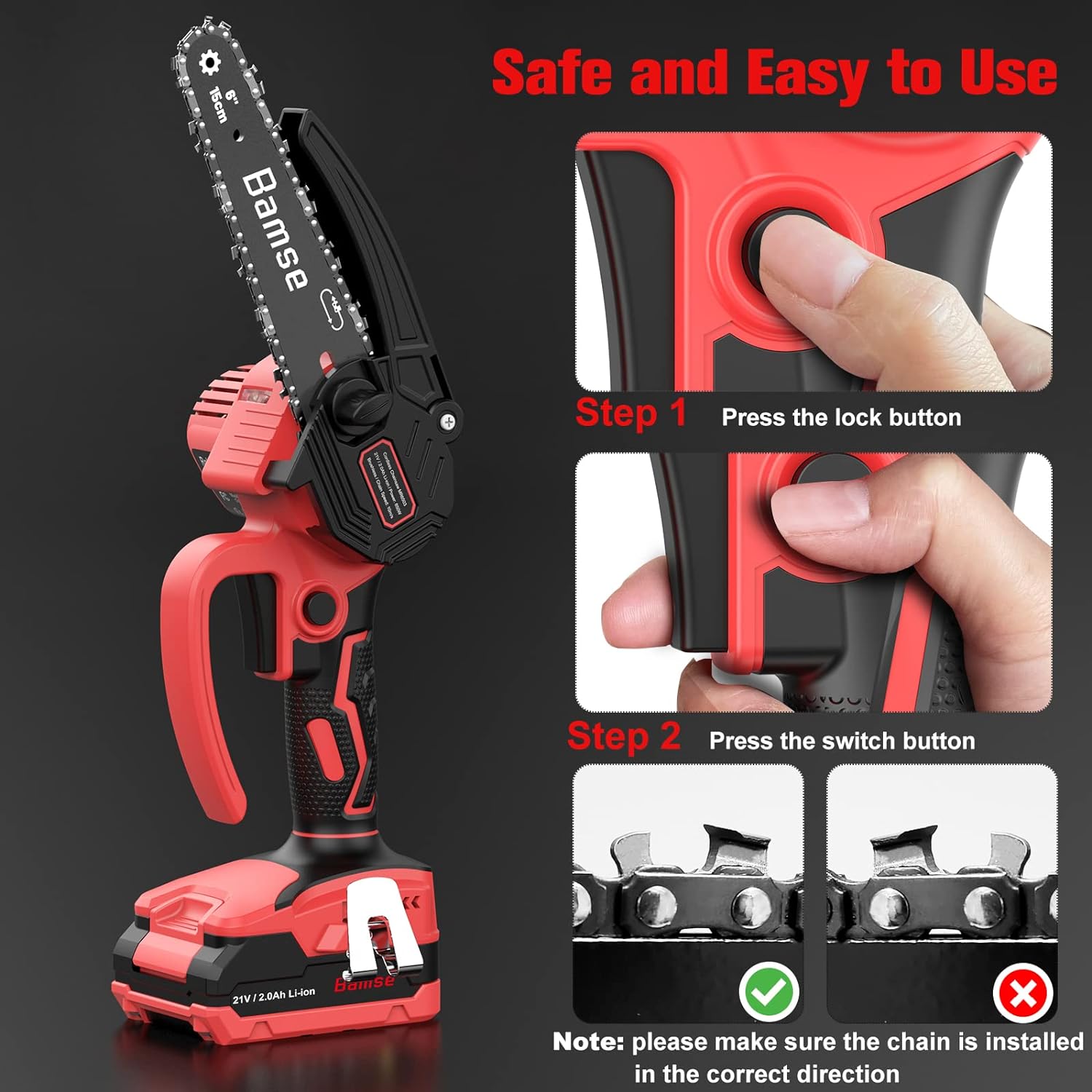 La sécurité de l’utilisateur est notre priorité. Notre tronçonneuse est équipée de multiples dispositifs de protection, notamment une chicane de protection supérieure rotative à 100°, une chicane de protection inférieure de la poignée et un bouton de verrouillage. De plus, elle nécessite une pression simultanée sur le bouton de sécurité et l’interrupteur pour démarrer, ce qui empêche les déclenchements accidentels de la chaîne.