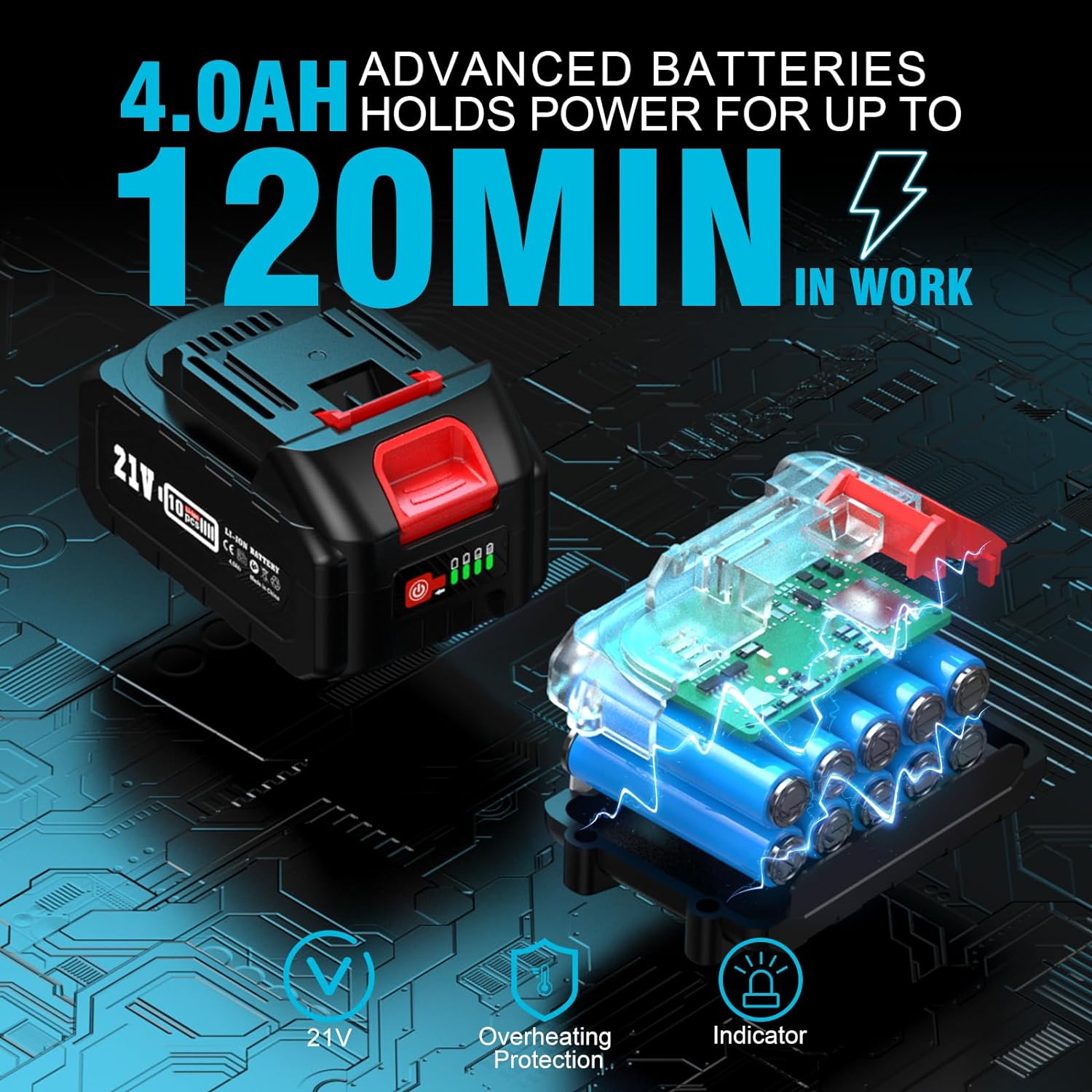 Avec deux packs de batteries 4.0Ah, notre scie offre une autonomie continue de 50 à 60 minutes après seulement 2 à 3 heures de charge. L’indicateur numérique de niveau de batterie vous permet de surveiller l’état de la batterie en temps réel, assurant ainsi une gestion efficace de votre travail.