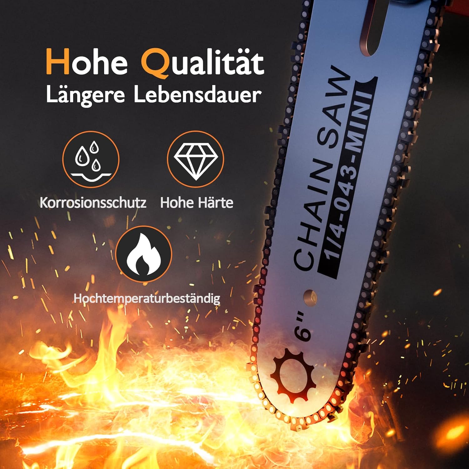 La chaîne en alliage trempé de notre tronçonneuse, d’une grande dureté et d’une acuité remarquable, assure une coupe nette et fluide. Elle est durable et ne se déforme pas facilement, même lors de travaux intensifs. Le guide-chaîne en métal qui l’accompagne est tout aussi robuste, ce qui contribue à la stabilité et à la précision de chaque coupe. Cette combinaison de matériaux de haute qualité garantit que notre petite tronçonneuse à chaîne peut facilement venir à bout de branches et de bûches de petit et moyen diamètre, pour un résultat impeccable à chaque fois.