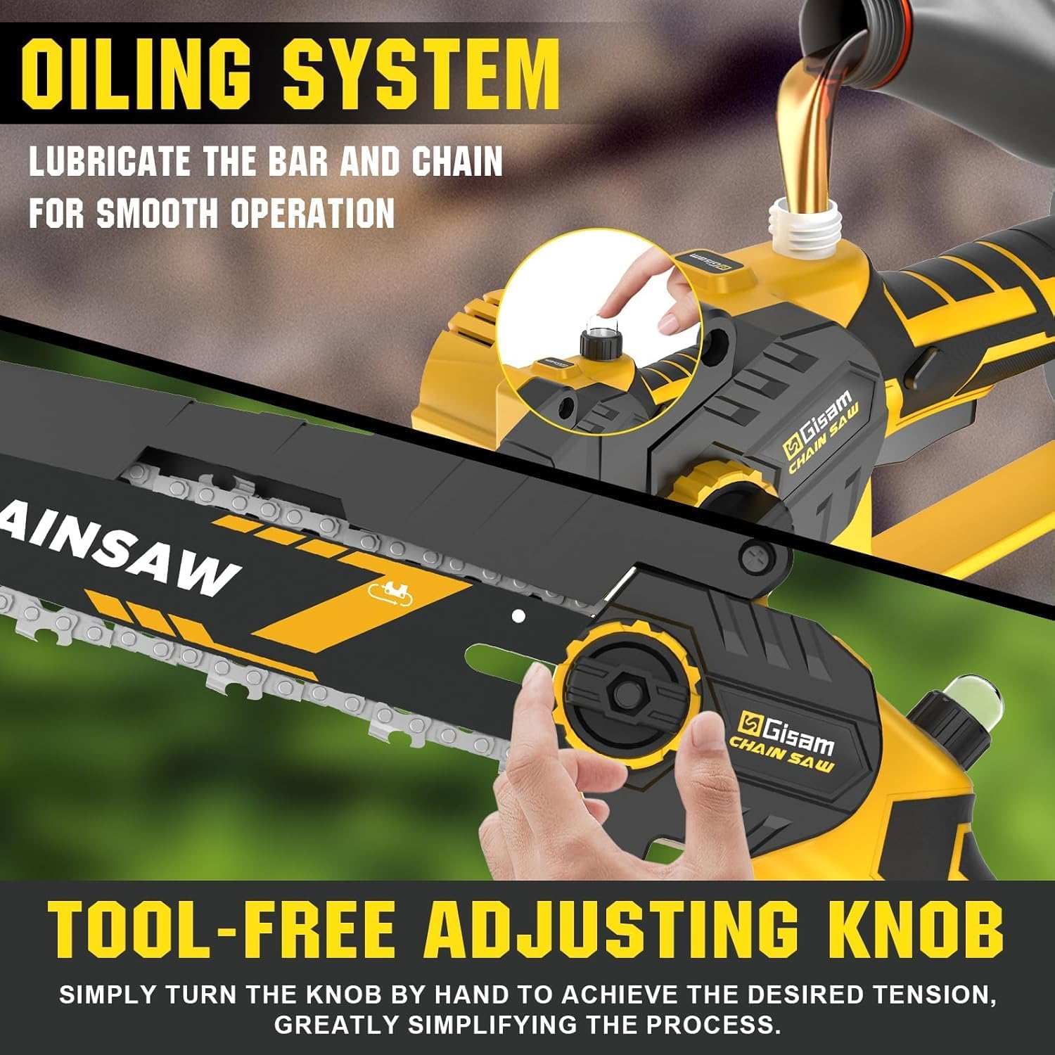 Nous avons équipé notre appareil de coupe de branches d’un système de lubrification automatique de la chaîne, ce qui élimine les fastidieuses étapes de remplissage manuel. Le réservoir d’huile intégré s’occupe de la lubrification de manière autonome et continue, pour un fonctionnement en douceur et une durabilité accrue de la chaîne et du guide. La tension de la chaîne est, quant à elle, gérée par un simple bouton, que vous n’avez qu’à tourner pour un ajustement précis et sans effort. Ces fonctionnalités vous offrent un confort d’utilisation inégalé et une prise en main sécurisée.