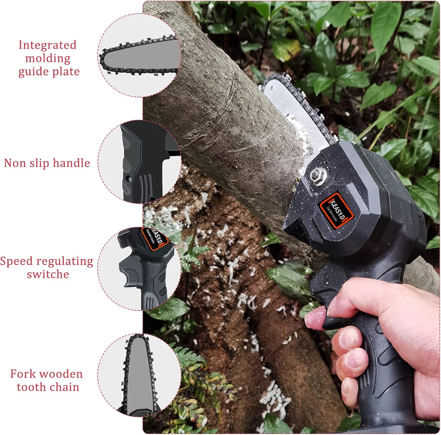 Grâce à sa conception ergonomique et légère, cette mini tronçonneuse peut être utilisée d’une seule main. Pesant seulement 0,7 kg, elle est facile à manipuler même pour les personnes âgées ou les utilisateurs novices. Vous pourrez l’utiliser pendant de longues périodes sans ressentir de fatigue excessive.
