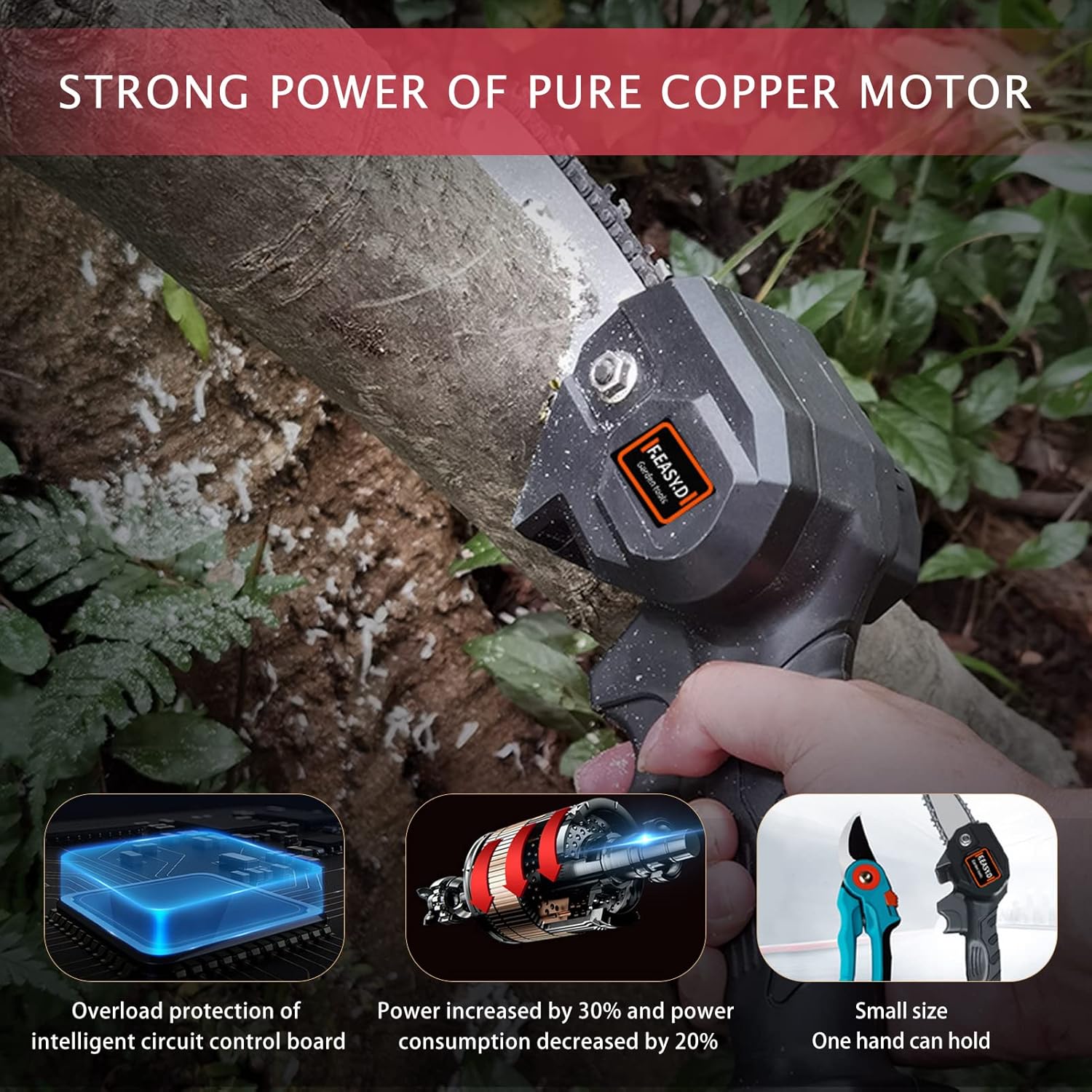 Notre mini tronçonneuse est équipée d’un moteur en cuivre pur, offrant une puissance élevée et une efficacité supérieure par rapport aux moteurs traditionnels. Ce moteur réduit l’usure, prolonge la durée de vie de l’appareil et empêche la surchauffe, vous garantissant une performance durable à chaque utilisation.
